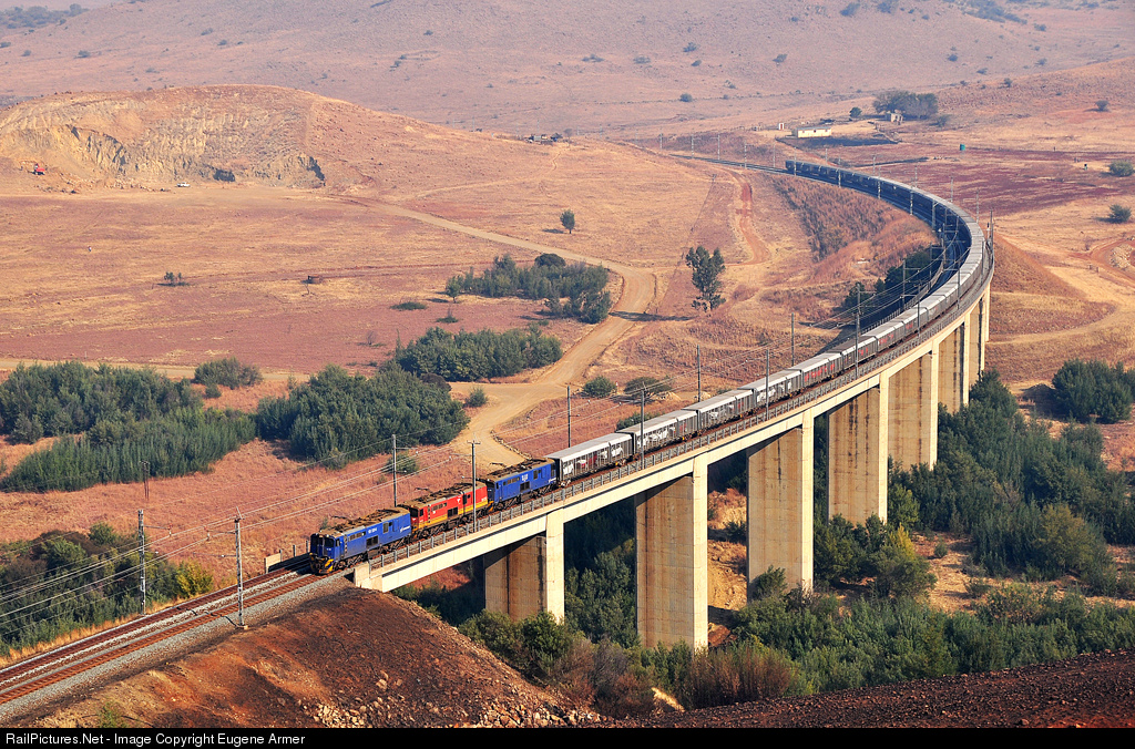 The double track Durban - Johannesburg main line crosses the Drakensberg mountains from kwaZulu-Natal into Mpumalanga province by way of the Majuba pass, over a distance of 37 km (23 miles). The ruling gradient is 1 in 66 (1.5%) with 800 metre (875 yard) minimum radius curves, three twin-bore tunnels and six bridges. At the bottom of the climb up the pass, this loaded 35-wagon motor car train from Durban is crossing an unnamed tributary of the Harte River with three clean 18E's up front. The wagons are type CML, rebuilt from container flats with steel mesh sides and flat rooves.