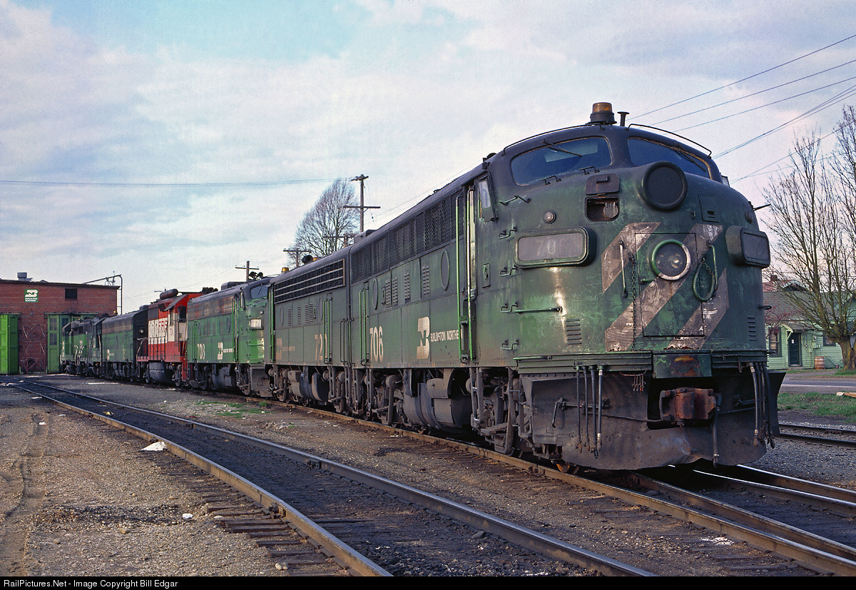 In the late 1970s BN was power short and continued to use older Fs and Geeps on secondary trains. This seven unit consist waiting its next assignment at Auburn, WA features BN 706, former GN 260A, a passenger F3A, along with 3 more F7s, a GP9, leased Frisco GP35, and a rebuilt GP30.