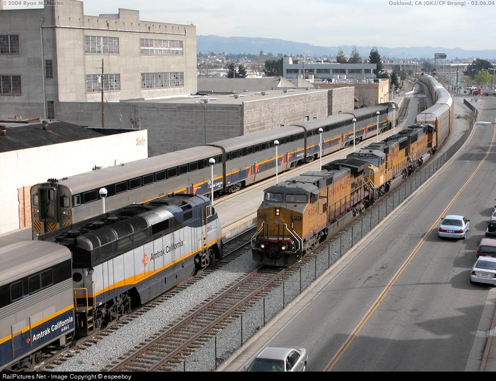 | A 12 hour late Warm Springs to North Platte autorack train is waiting for a crossover signal to set-out some racks at East Oakland Yard. An in service and out of service Amtrak Capitol both occupy the Oakland Jack London Sq. (OKJ) station. |