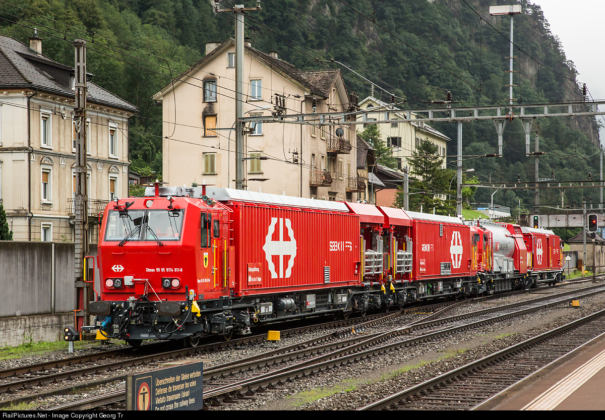 Brand new fire-fighting and rescue train "LRZ14" (Lösch- und Rettungszug LRZ14) of the SBB leaving Erstfeld for a test drive on the Gotthard line to Göschenen. The 4 vehicles train from Windhoff/Germany will be based in Erstfeld and is decorated with the blazons of canton URI. It will serve for the new Gotthard base tunnel, which will open for traffic in 2016, as well as for the Gotthard mountain line. From right: Equipment unit XTmas 99 85 9177 011-5 with cab, self propelled with two 390 kW diesel motors. Fire fighting and water supply unit Xans 99 85 9375 011-5. Rescue unit XTmas 99 85 9174 021-7 with cab, self propelled with two 390 kW diesel motors. Rescue unit XTmas 99 85 9174 011-8 with cab, self propelled with two 390 kW diesel motors. The train can reach 100 km/h. Each rescue unit has room for about 60 people and this units will operate in a continous shuttle mode, while the equipment unit and the fire fighting and water supply unit will remain at the scene of the accident. An equal train will be based near the south portal of the Gotthard base tunnel in Biasca.