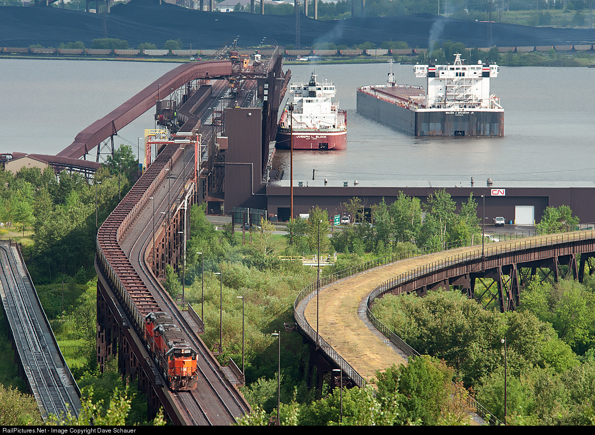 A solid set of three Bessemer units (909, 906, 903) pull empty ore cars off Dock 6 while the vessels Joe Block and Walter J. McCarthy Jr pass. The grass covered trestle on the right served the shuttered ore dock No. 5, which was taken out of service in 1985.