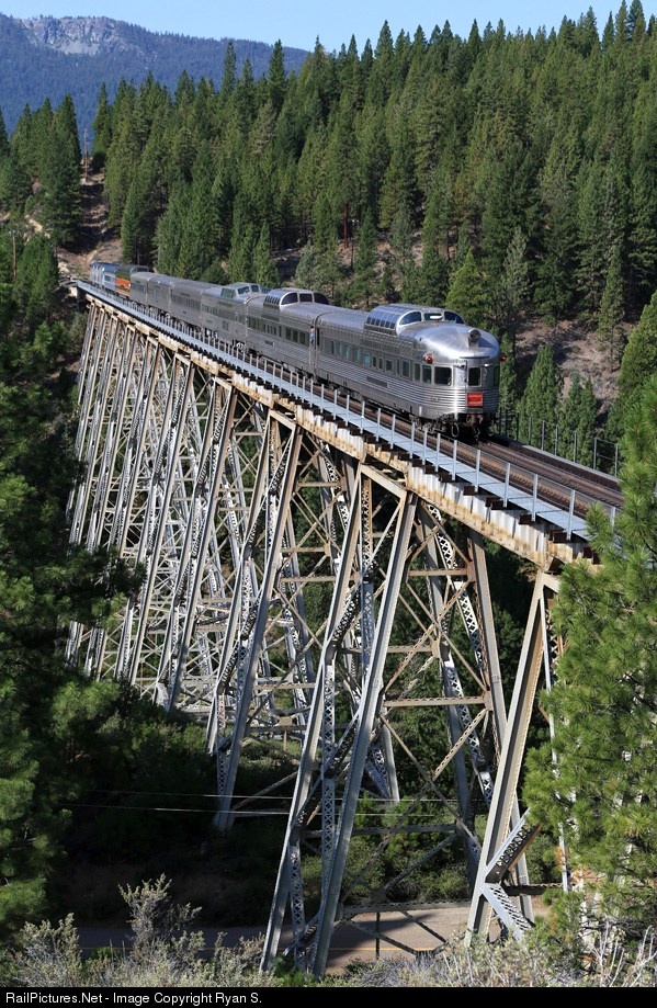 Harkening back to the days when the California Zephyr plied the rails of Western Pacific's 3rd Subdivision, the westbound Feather River Express rolls across Clio Trestle with former California Zephyr dome-lounge-observation 'Silver Solarium' bringing up the markers. The California Zephyr was a Chicago to Oakland dome equipped streamliner operated by the CB&Q-D&RGW-WP which toured some of the most spectacular mountain scenery in the western United States. First operated in 1949 the Zephyr enjoyed a 21 year career before calling for the last time in March of 1970. The special train, operated by Amtrak, is returning to Emeryville after spending the weekend in Portola, CA for their annual Railroad Days event.