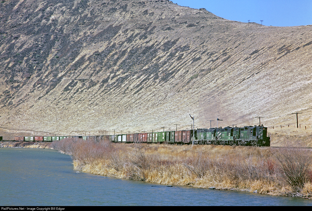 BN 1750 and three other Geeps head a westbound Cle Elum turn from Yakima through the blades in the Yakima River canyon. The train will drop its cars in Cle Elum yard where another turn originating in Auburn, WA will retrieve them and take them over Stampede Pass to the coast.