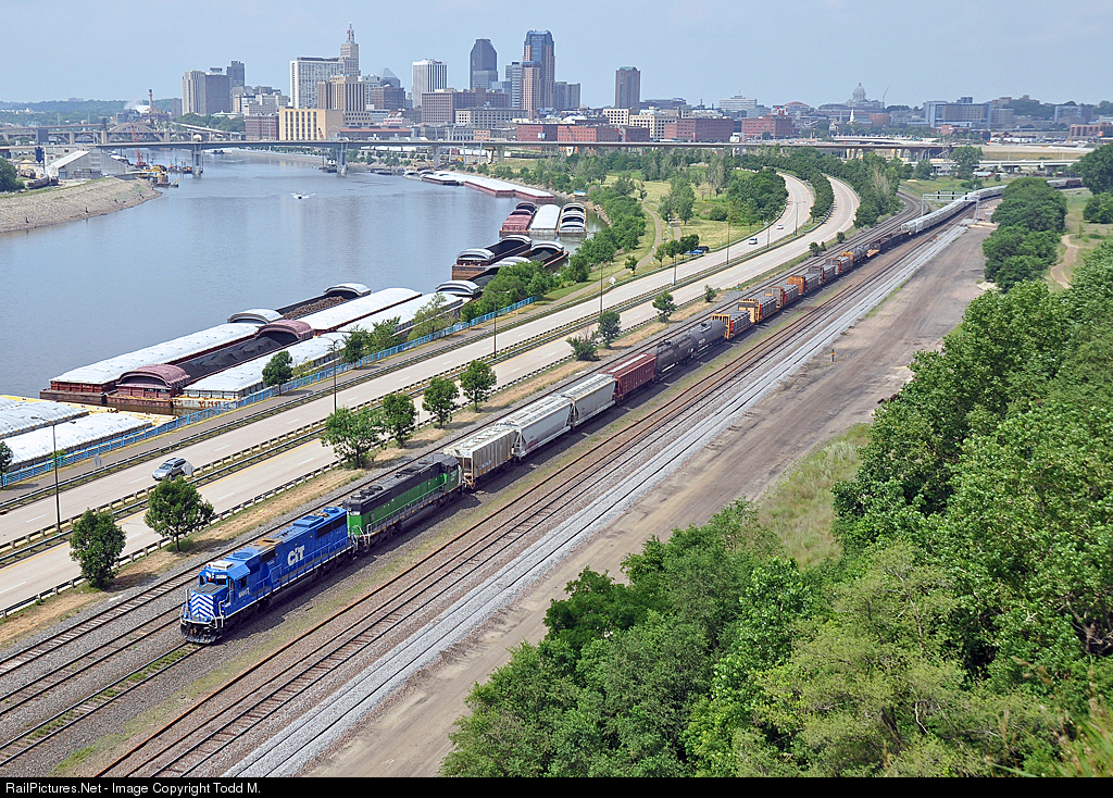 | CIT 6017 and BNSF 1427, an SD60 and a SD60M respectively, pull a mixed freight east under Daytons Bluff and the St. Paul skyline on a hot, humid and hazy afternoon. The folks boating on the Mississippi river look like they have the right idea on how to spend the day. |