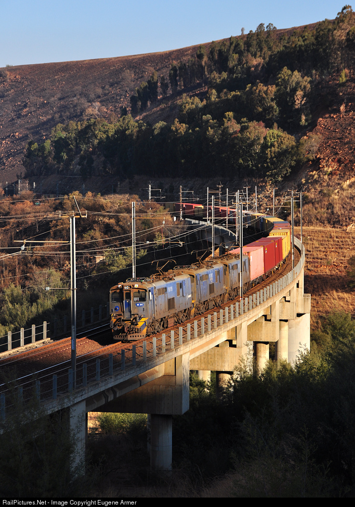 One of the six bridges on the Majuba Pass between Ingogo and Charlestown is the 200 meter (656 ft) Trowe's Viaduct at Glen Harte, just below the more well known Harte River bridge. In this view, late afternoon shadows are fast encroaching on the bridge, as three 18E's with a container train from Durban to Johannesburg make their way up the Pass.