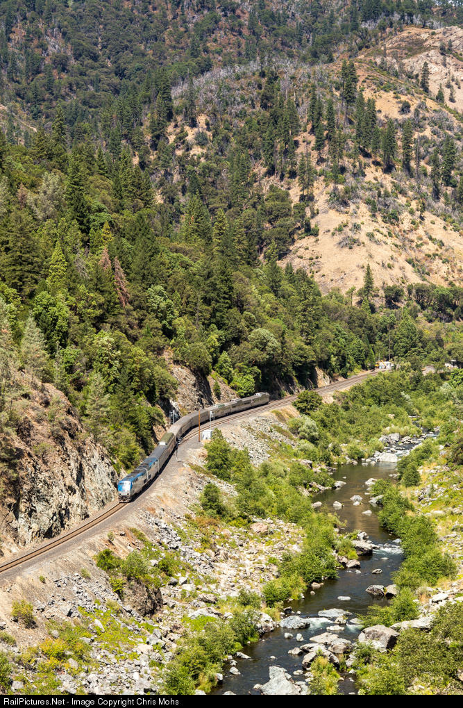 | ,Amtrak 137 drifts downhill, past the siding at Pulga with the Domes To Portola special on its return to the San Francisco Bay Area. |