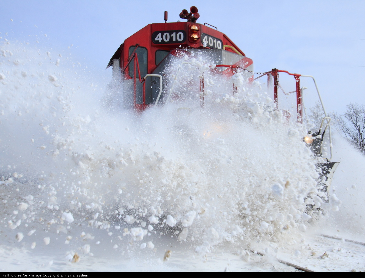 | Snow Blower - EMD's version of the common snow blower. Not quite a Toro, T4's lead unit does its best to clear State Hwy 59, of the previous nights snowfall... Get ready to get wet! |