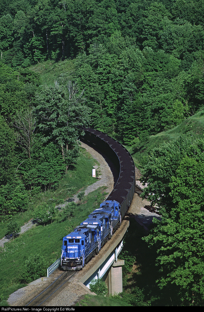 A three unit "Bailey Helper", including an ex-MGA unit (Conrail 2037), has just crested the summit of the ex-MGA's Manor Branch. The helpers will stay attached for about three miles to use their braking power to hold the loads in check.