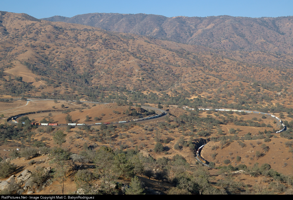 With three GEs on the point and two more bringing up the rear, all working hard to keep it's battle with gravity in check, a Roseville bound manifest negotiates the most famous portion of rail on Tehachapi Pass.