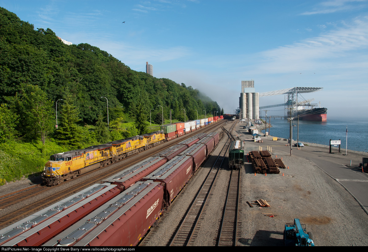 | A Union Pacific intermodal train heads past the Temco grain silos at the south end of Commencement Bay. The fog has receded just enough to reveal a ship loading at the silos. |