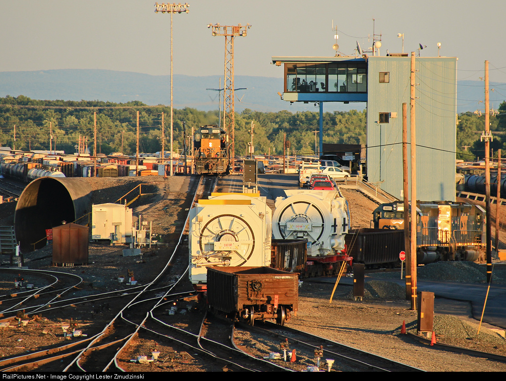 What I did on my Summer vacation, redux: High and wide loads run around the hump in Selkirk Yard; following the DO NOT HUMP placards on each of the loads. SD40-2s 8850 and 8851 slowly navigate the curves as another SD40-2 and slug wait atop the hump.