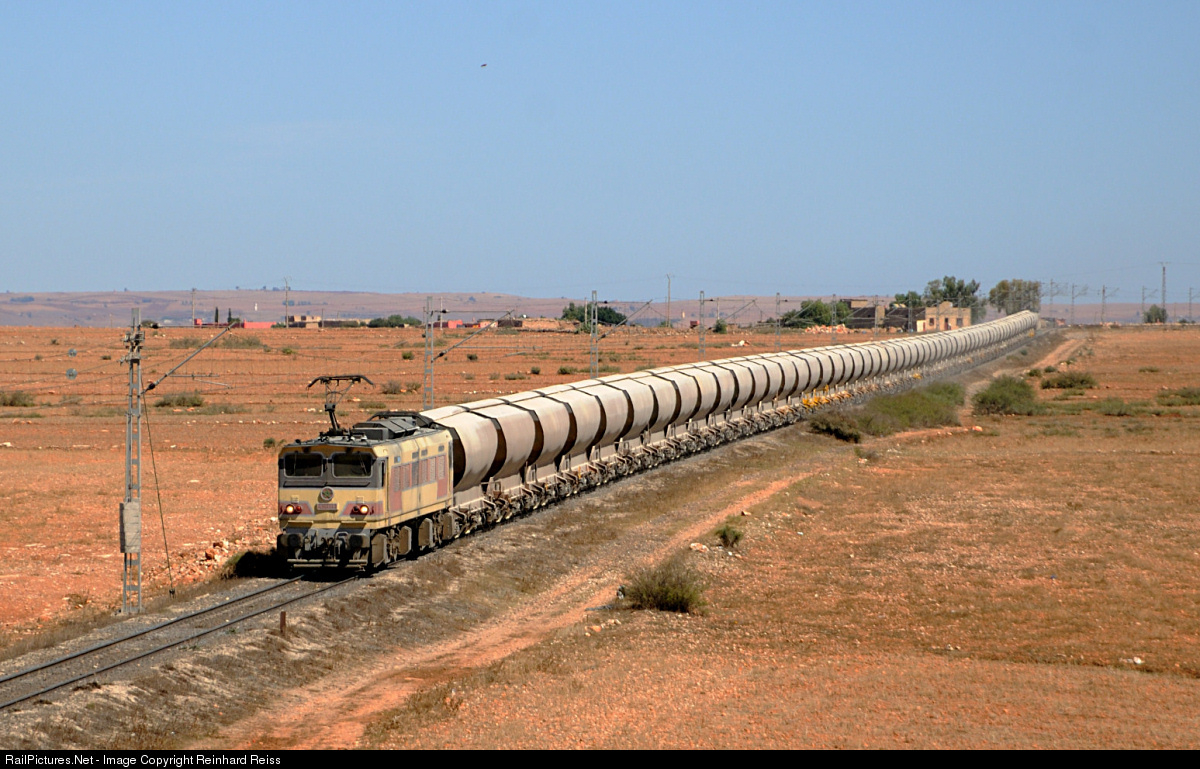 | A train from Oued Zem to Casablanca loaded with phosphate approaches Khouribga with leading E 1118 and E 1202 on the rear end. Overall weight of this train is 4800 tons. |
