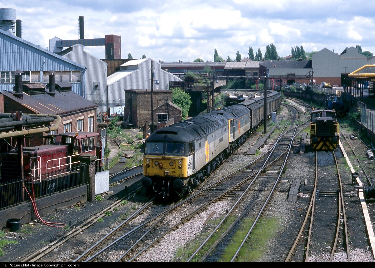 | 47218 and 47053 arrive at the Rover car factory at Longbridge with a train of car body panels from Swindon. Note several of Rover`s own locos are present. The massive car factory is now just a memory.