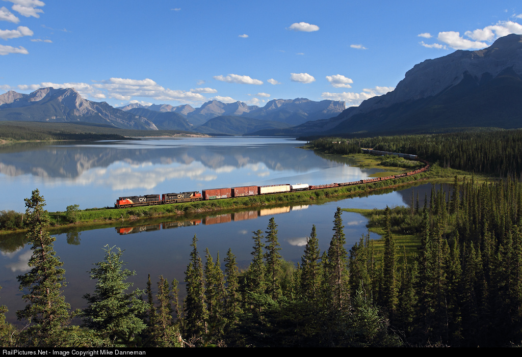| Canadian National train No. 302 passes by a tranquil Brule Lake while traversing Robertson Curve, at Swan Landing, Alberta, on July 7, 2014. |