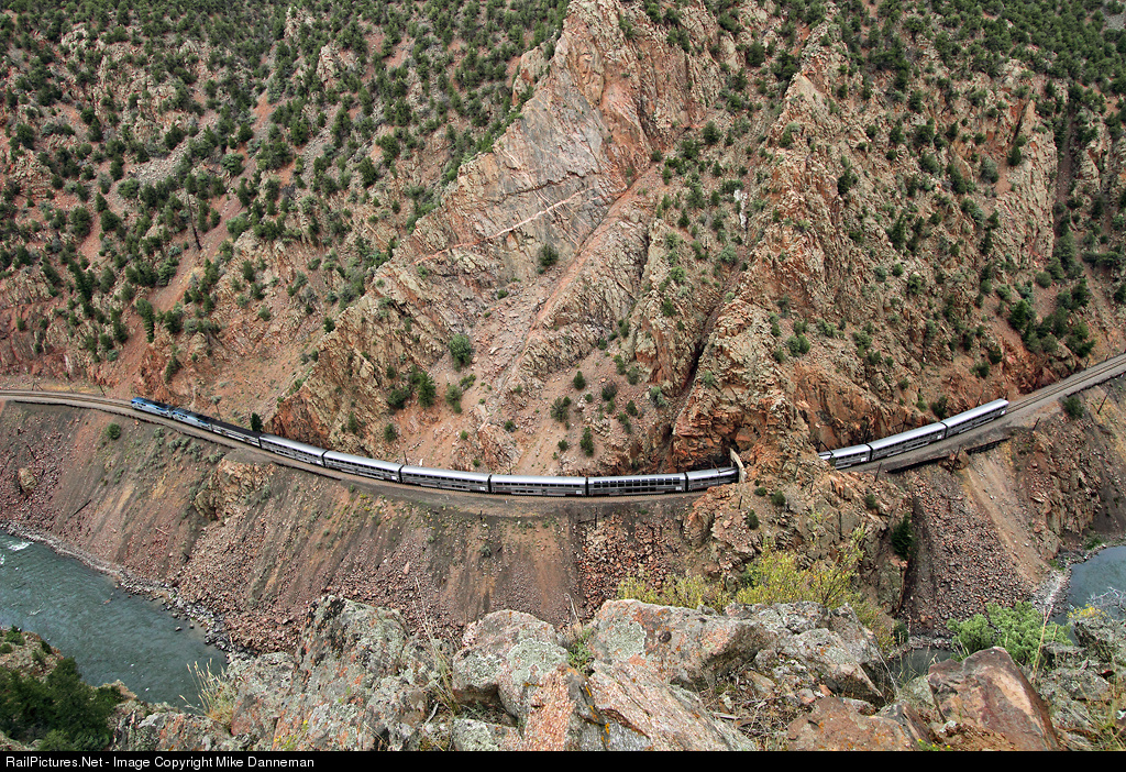 Amtrak No. 5, the westbound California Zephyr, curves into a smile as seen from high above Tunnel 40 in Little Gore Canyon west of Azure, Colorado, on August 21, 2014.