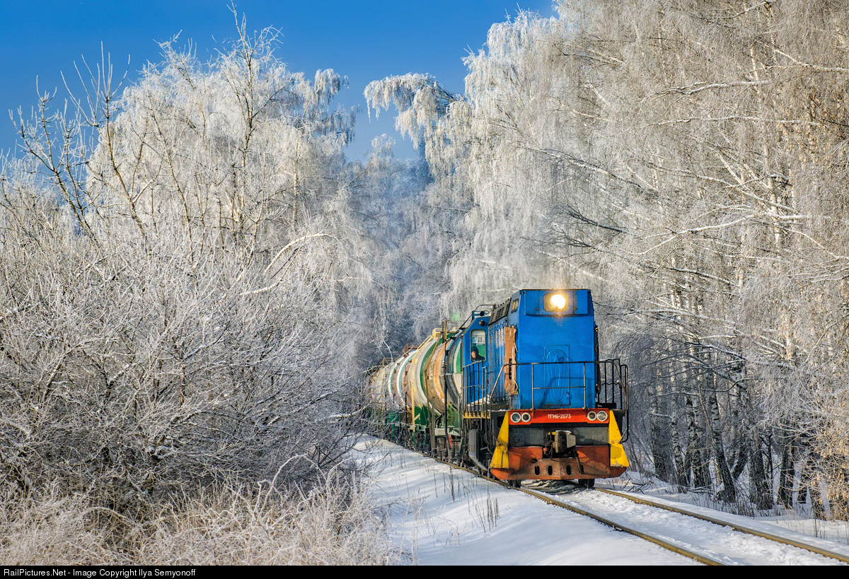 TGM6A-2073 moves with oil train on "Moscow coke and gas plant"("MOSCOKS"). Part of "MOSCOKS" railway passes through the picturesque arboretum in southern Moscow. The outside temperature was near -15 F.