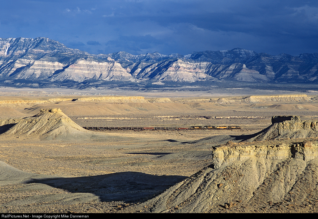 With late season thunderstorms rumbling over the Bookcliffs in the background, Union Pacific’s LJP45 “dirt train” local approaches Mounds, Utah, late on the afternoon of November 21, 2003. Rio Grande SD40T-2 Tunnel Motors Nos. 5390, 5371 and 5349 bracket a UP SD40-2 for power, and the train will soon be at the junction of the Sunnyside Branch at West Mounds, ready to head west on the Green River Subdivision to Helper.
