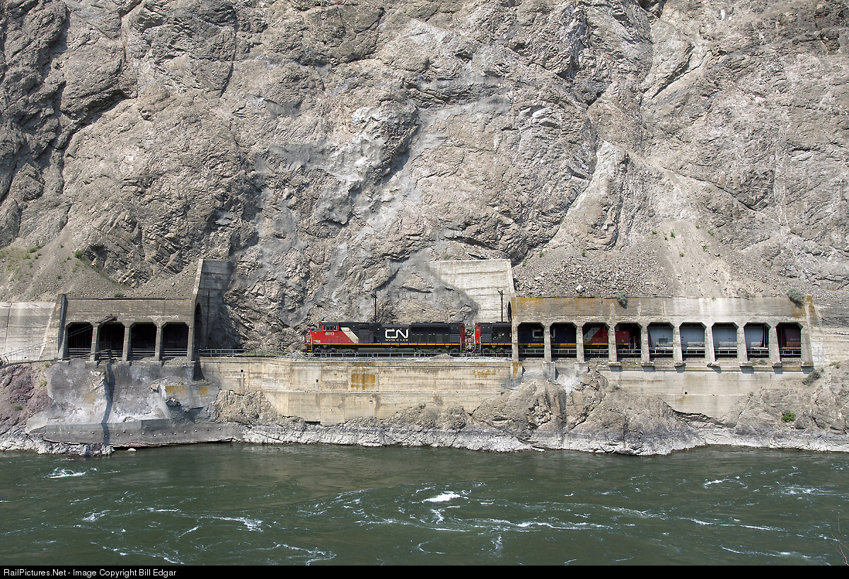 | CN train 845, a grain train looks more like an N scale model than a real train as it plays peek-a-boo through the "honey moon" tunnels on the CN side of the Thompson River west of Spences Bridge. CP and CN both use CN track for westbound trains, and use CP for eastbound trains in this area. |