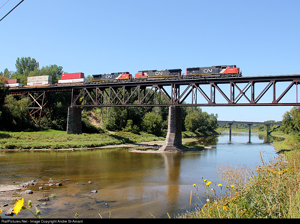 | Intermodal train, CN 120 is crossing the Nicolet River, on the Drummondville Sub, en route to Halifax, NS |