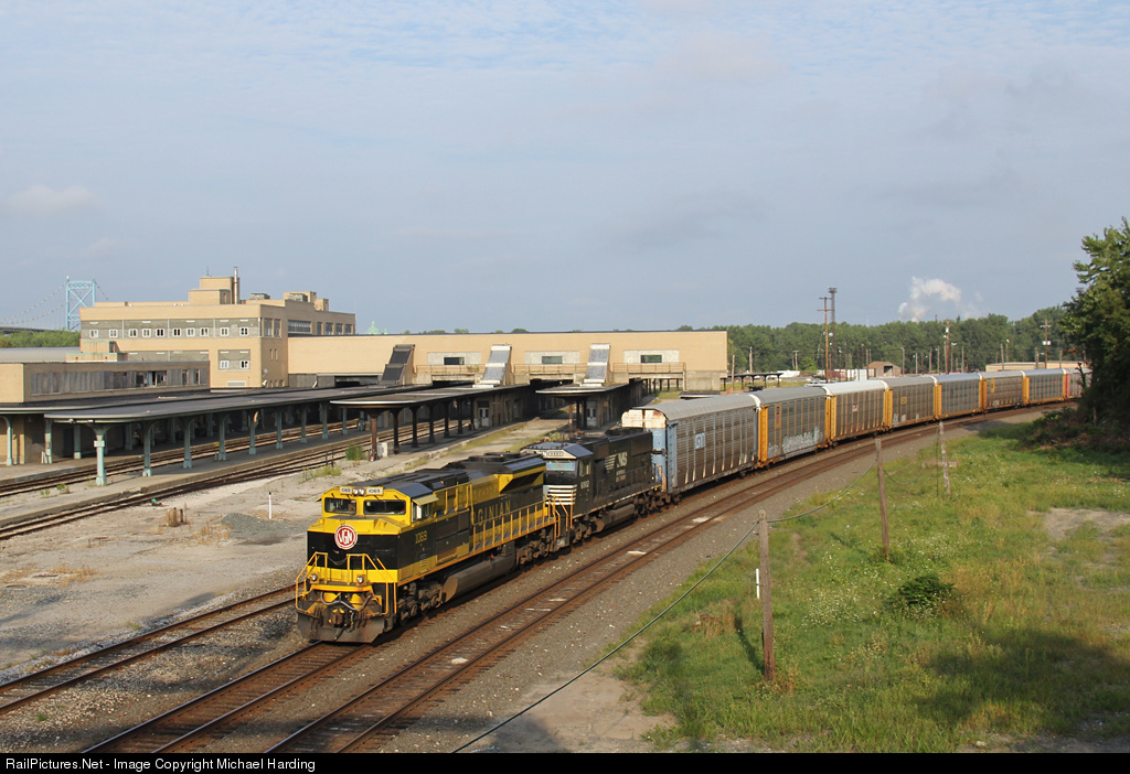 The Virginian heritage unit leads and auto rack train destined for Detroit by the former NYC depot in Toledo.