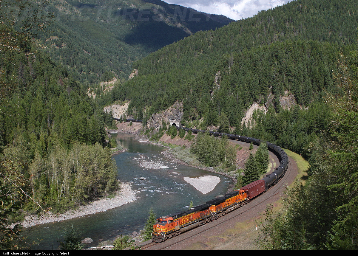 BNSF 4402 and 7386 in front and 763 / 5132 as DPU are hauling a long crude oil train unit train westwards along the Flathead River.