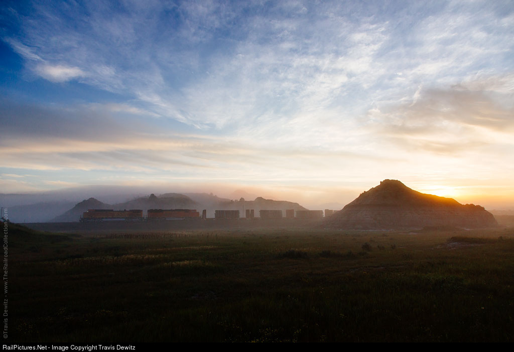 A favorite place in North Dakota for many to photograph trains is Sully Springs. The tracks here run through the very scenic Badlands on the outskirts of the Theodore Roosevelt National Park. Cool early morning temperatures help create a low hanging fog that settles in the low spaces around the layered sedimentary rocks that make up the area. The sunrise just breaks past the surface as this train glides west through western North Dakota.