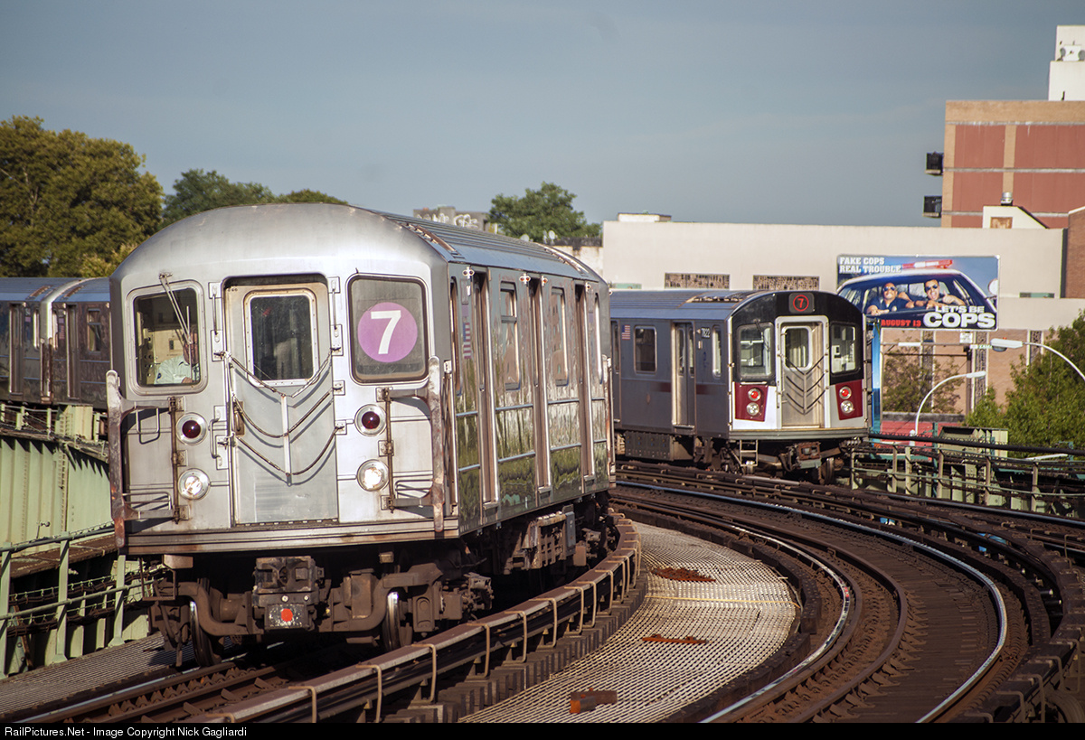 Here, a set of older R62As runs back into Manhattan while a set of R188s, the newest cars in the system, runs outbound towards Flushing-Main Street, Queens.