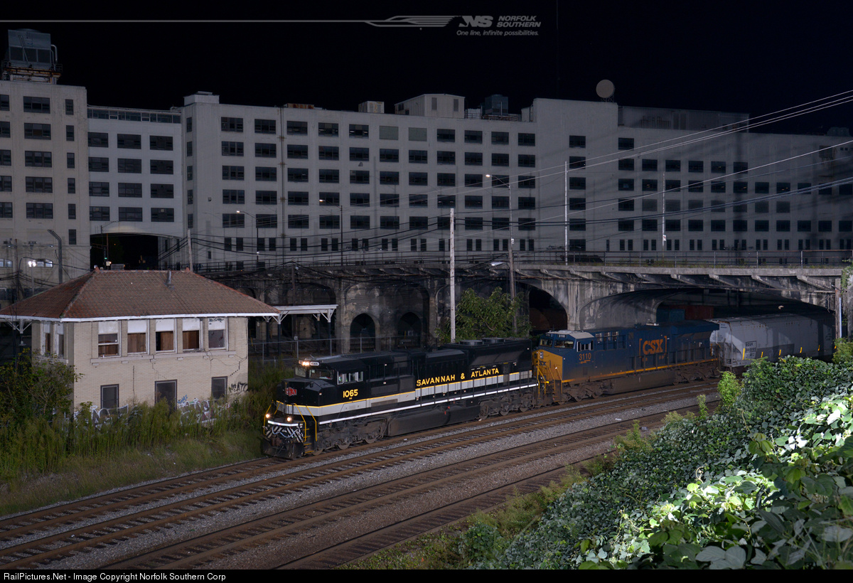 Norfolk Southern's "Savannah & Atlanta" heritage unit (SD70ACe #1065) and CSX ES44AC #3110 leads CSX train Q61409 through "The Gulch" at control point Spring in downtown Atlanta, Georgia. CSX utilizes trackage rights over the NS mainline between this location and East Point, GA. This train originated in New Orleans and is bound for CSX's yard in Hamlet, NC. The big building in the background is the former Southern Railway headquarters, located on Spring Street, and is still owned by Norfolk Southern, but is no longer used on a daily basis. It does still serve a purpose, though, as it is often used by movie production companies for all sorts of movies and TV shows. It is probably most recognized from AMC's "The Walking Dead". The telephone pole behind the S&A unit points up to where Merle was handcuffed to the roof in the first season of the "Dead". From 1905 through 1970, the Spring Street tower was the main control point for movements into and out of Atlanta's Terminal Station, hosting famous passenger trains such as the Southern's Crescent and Ponce de Leon, Central of Georgia's Nancy Hanks and Man 'O War, and Seaboard's Silver Comet (just to name a few). Each arch of the Nelson Street bridge seen here used to span several tracks that fed into Terminal Station, which was located out of the scene to the left. There are nowhere near as many tracks in place today, but the location is still an important junction on the Thoroughbred network, as well as a vital link to CSX's system. Photo by Casey Thomason. For more information about Norfolk Southern, visit www.nscorp.com