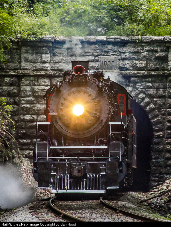 | Southern Railway #4501, making it's public debut after a major three year rebuild, emerges from the pre-Civil War Missionary Ridge Tunnel while leading the 2:25 train to East Chattanooga. This tunnel and three mile section of trackage was part of the Southern (originally ETV&G) mainline, and was later abandoned due to the current realignment around the ridge. |