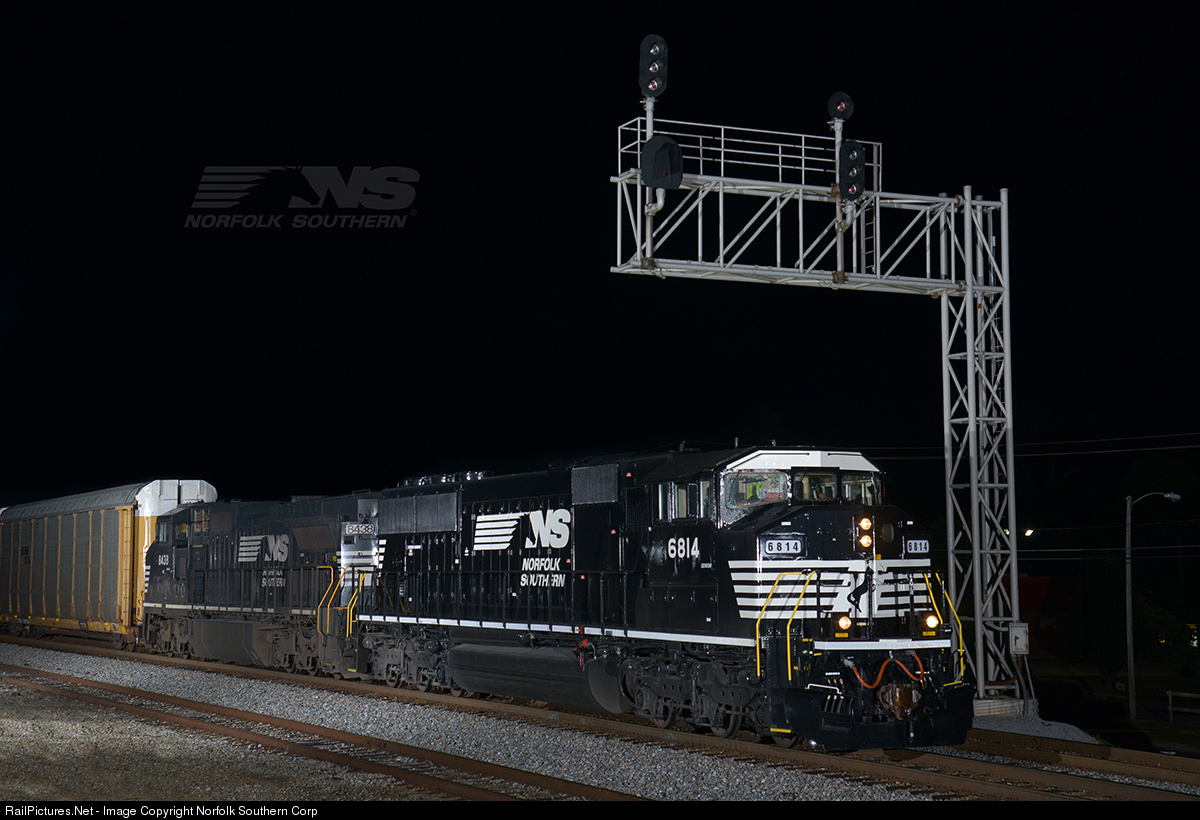 Norfolk Southern train 298 rolls east through Tallapoosa, GA, during the last few minutes of 9/11/14. Leading its first train after upgrades at Juniata Shop is "triclops" SD60M #6814. Built in 1989 as Burlington Northern 9207, 6814 is one of 8 ex-BN units recently acquired from National Railway Equipment, and the first to receive the Thoroughbred paint scheme. Photo by Casey Thomason. For more information about Norfolk Southern, visit www.nscorp.com