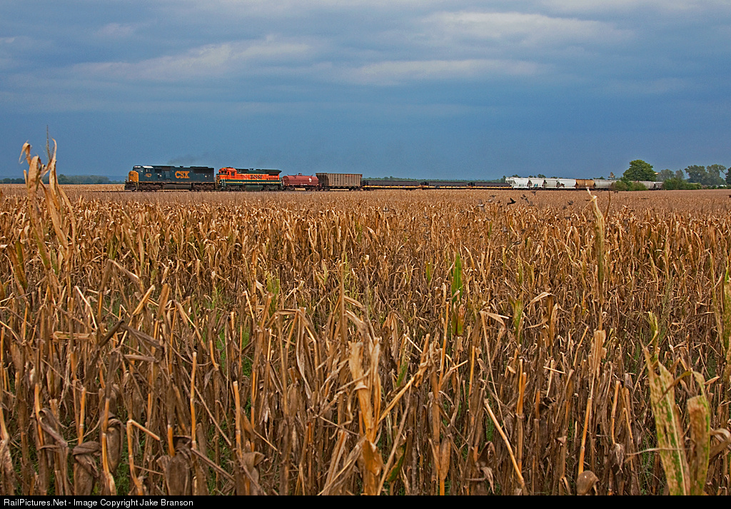 BNSF manifest freight H MEMGAL9 07A works its way eastbound (though it is actually headed west at this particular moment) through rural Orchard Farm, MO. Above the train, a storm is building that will soon dump buckets worth of rain onto the many crops in the area. Trailing the leading CSX SD70MAC is BNSF 588, a 1989-built B40-8. It is quite uncommon to see one of these working a manifest freight, and amazingly, this was the first of two on two consecutive trains. The succeeding manifest had the next unit on the roster, BNSF 589, in the trailing position.