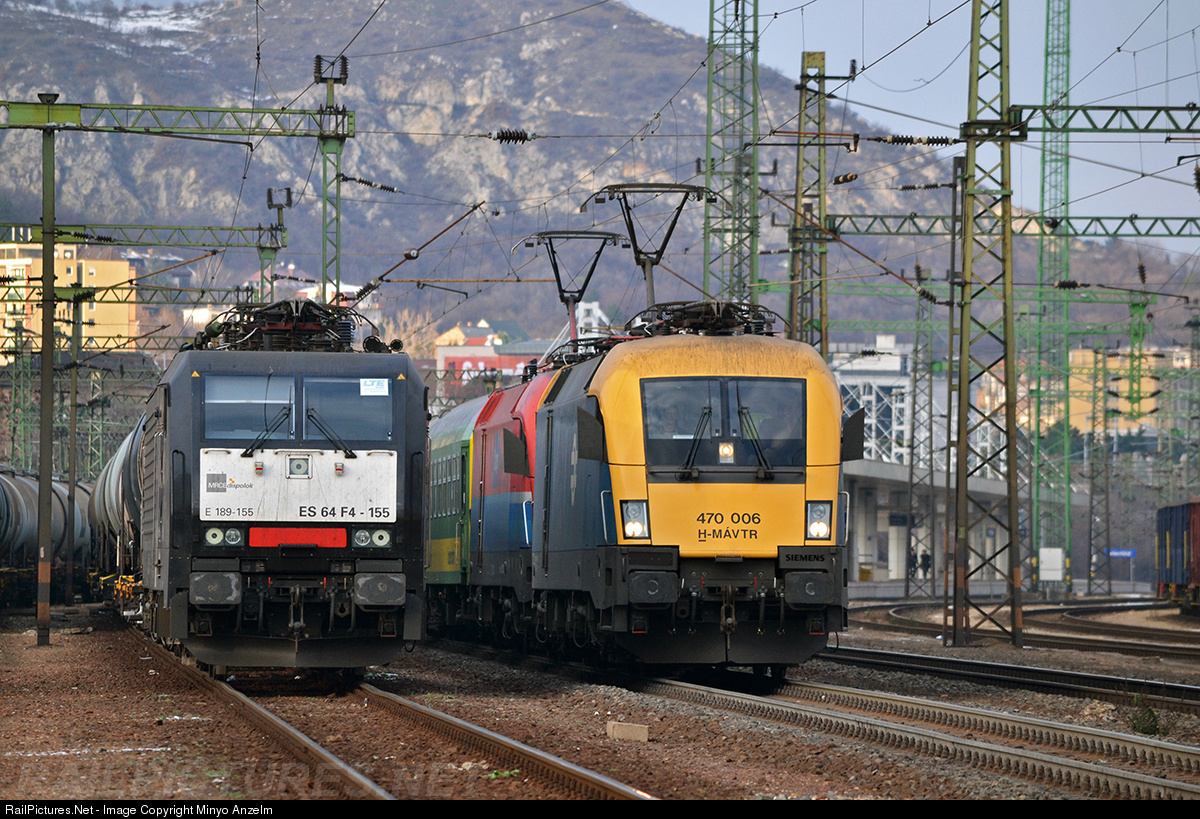 InterCity train "Alpokalja-Kékfrankos" (IC924) running from Budapest Keleti railway station to Sopron, and with direct carriages to Szombathely with MÁV Traktion's 470 006 and Rail Cargo Hungaria's 1116 013 numbered ES62U2 type engines. A rare moment, that both engines have the rear pantograph up, and both engines' mirrors are opened. At the left there is the LTE's 189 155 numbered ES64F4 type engine with the oil train coming from Kiskőrös. |