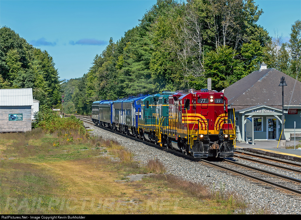 | Pan Am Railway's Office Car Special train is southbound on the NECR Palmer Subdivision passing original Boston & Maine freight houses and depot at Claremont Junction, NH with B&M Heritage GP9 77 and Maine Central Heritage GP9 52 leading the PAR-1 and PAR-2 FP9s and OCS train for the trip back to East Deerfield, MA following the Glory Days Festival in town. |