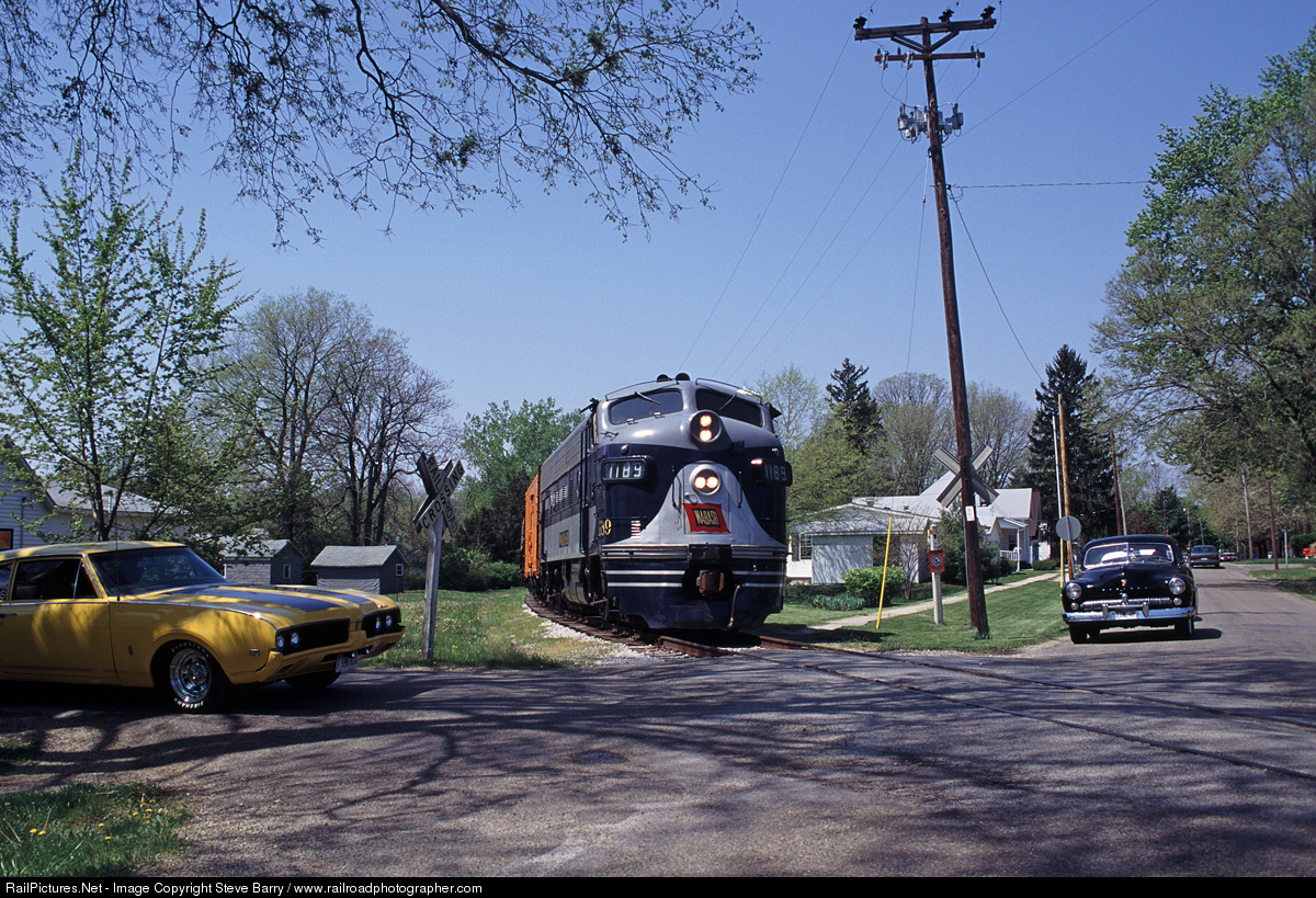 | Wabash F7A No. 1189 passes through downtown Monticello as a pair of classic cars meet at the grade crossing. This scene is from one of the railroad photography days organized by Arthur Purchase at the Monticello Railway Museum. |