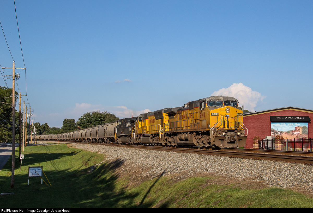 | Following several overcast days, the sunshine and nearly cloudless skies return just in time as NS 51Q races towards Atlanta with a couple of Union Pacific motors leading the empty grain train through historic downtown Buford. |