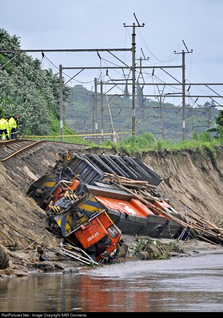 | Another angle on Photo ID 438475. Heavy overnight December summer rain resulted in the Amanzimtoti River coming down in flood and eroding into the supporting bank of the line down to the KwaZulu Natal South Coast at the mouth of the river. Despite the line being trollied and clear, 37-030 was at the front of a very early morning timber train for Saiccor / Umkomaas and unfortunately the sodden bank gave way, with the result being what you see. Thankfully there were no serious injuries to the crew. |