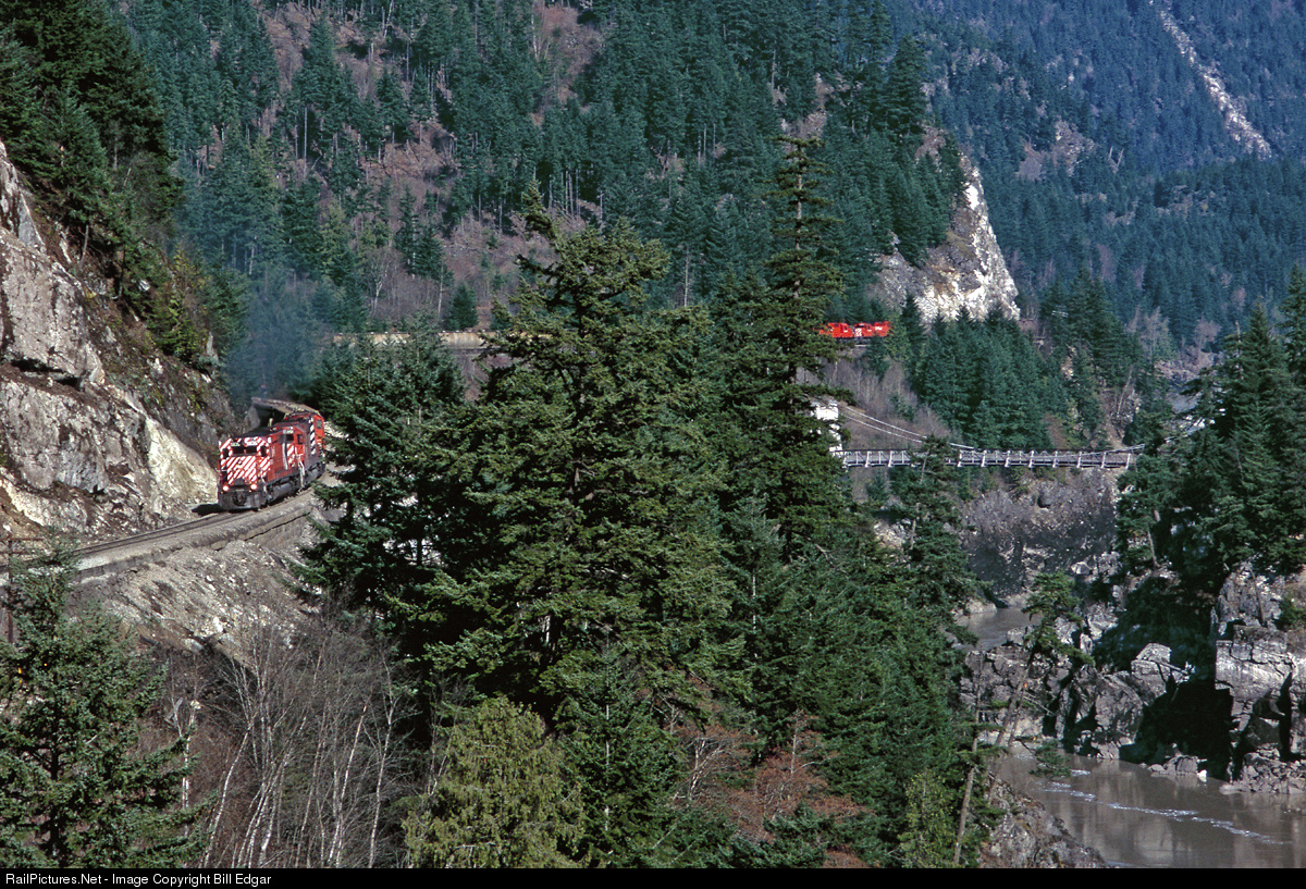 | A westbound grain train led by a candy cane schemed SD40-2, No. 5835, snakes its way around the curves of the Fraser Canyon at Spuzzum. This shot, taken from Hwy 1 bridge depicts the older suspension bridge the travelers once traversed while driving through the canyon. Mid-train remote control slave units peak through the trees. |