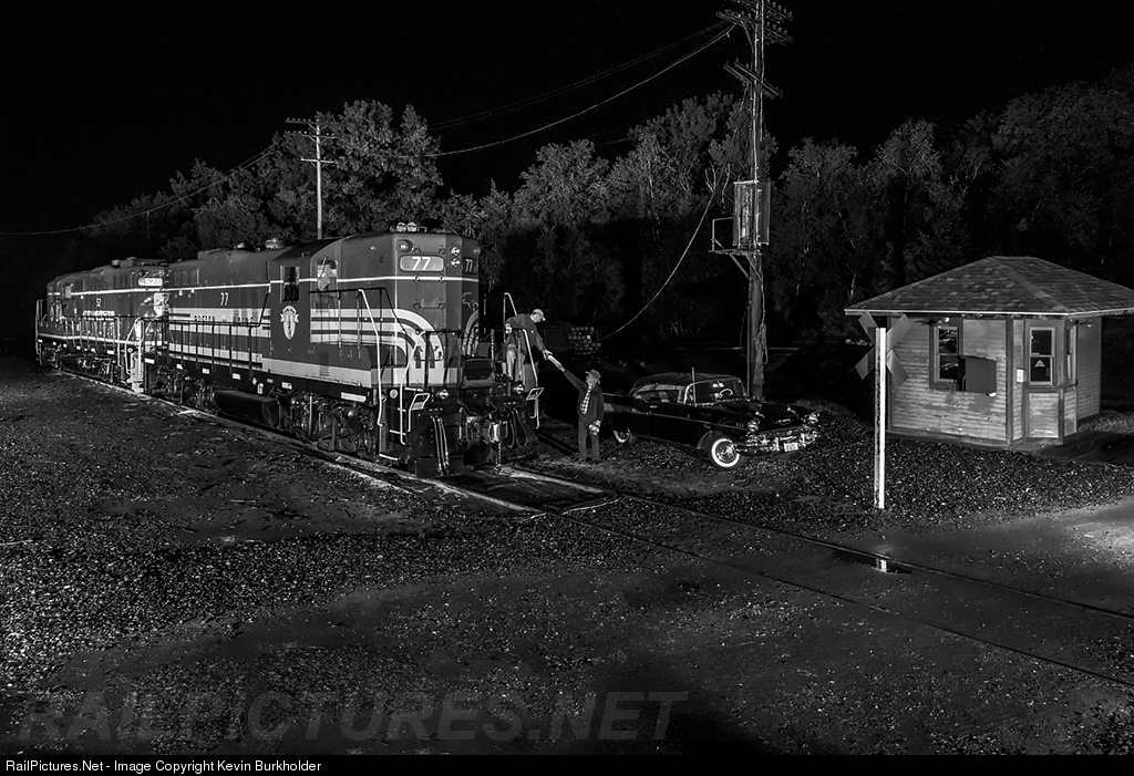 | The year is 1957 and the operator at White River Junction, Vermont is passing up orders to an arriving Boston & Maine UJ-2 train at 12:30 a.m. - the nightly except Sunday Berlin, NH to White River Junction train that normally arrived at this time. The UJ-2 tonight has a brand new EMD GP9 #77 leading the way, while the operator must be making good money as he has his new '57 Chevy along to work on this particular night. The scene was actually made at the 22nd Annual Glory Days of the Railroad Festival in White River Junction with Pan Am Heritage GP9 #77 and a gracious community member who is part of the local Carz group. Ironically both the GP9 and the car are GM products built in 1957!