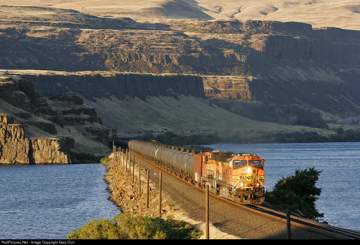 West Bound BNSF Crude oil train rolls along the Fill at Horse Thief Lake near Avery, Washington..Heading into the setting sun on a beautiful summers evening, the dry hills in the distance and the wide Columbia River make this one very photogenic subdivision on the BNSF Ry..