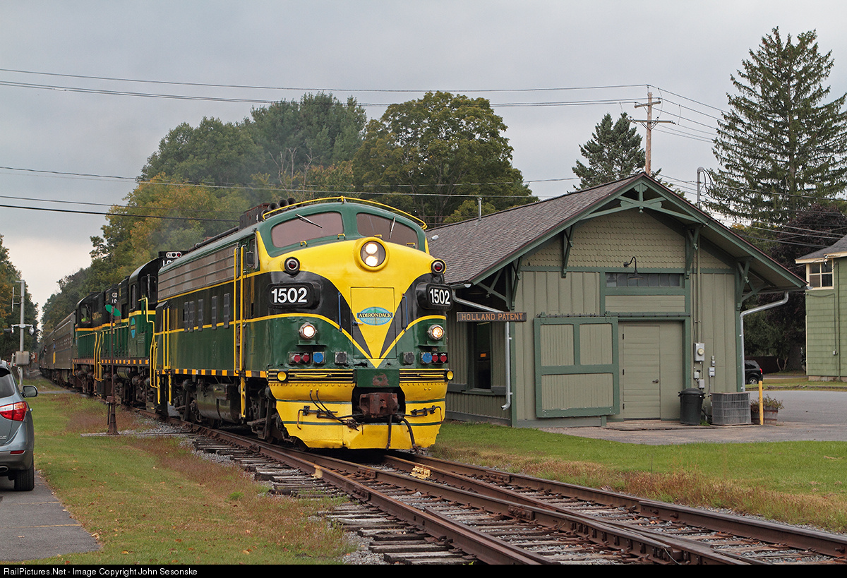 Adirondack Scenic's freshly painted FP10 rolls NB past the ex New York Central depot at Holland Patent with 2 ex CP Rail RS18's trailing. The train is the 9:30am train from Utica to Thendara. This unit is the former GMO 884A(F3A), MBTA 1151(FP10), MNCR 412(FP10).
