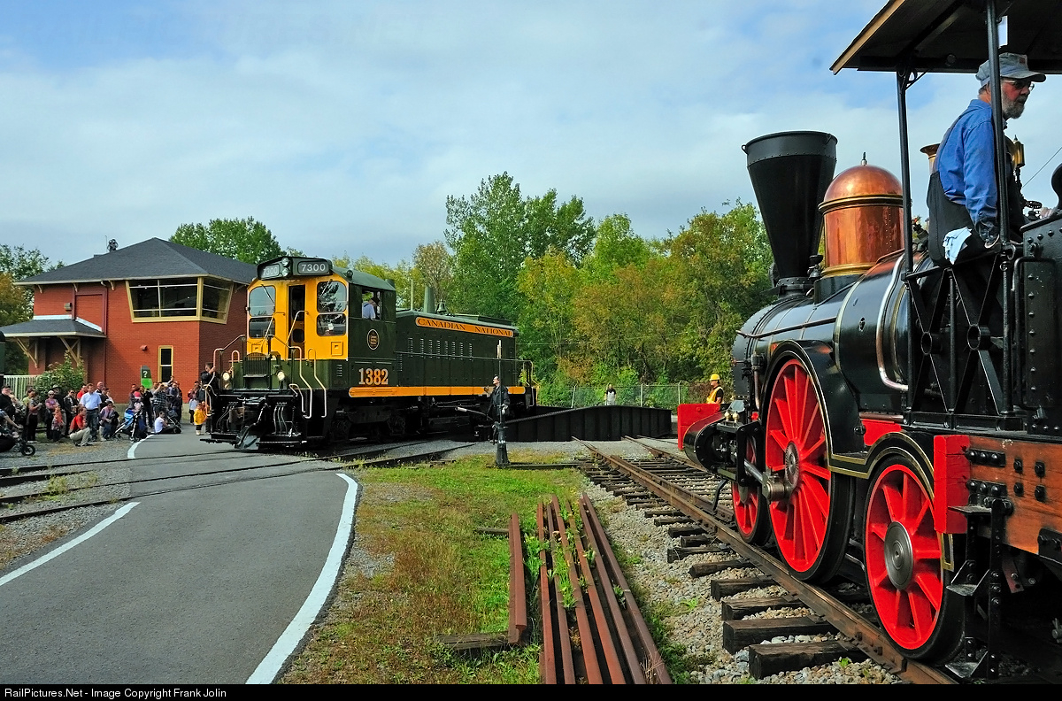 Originally Canadian National # 1382, freshly repainted Exporail's newest diesel unit ex-CN SW1200RS #7300 leaves the turntable as the ''John Molson''steam engine awaits its turn for a spin.