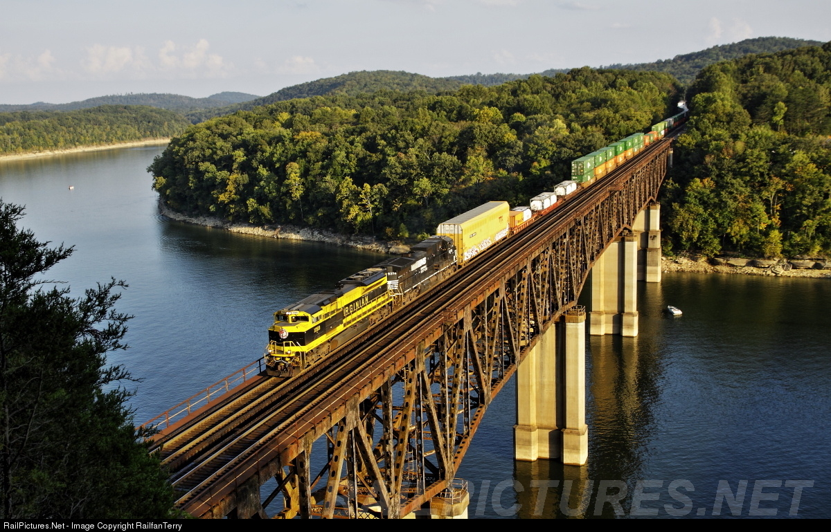 NS #1069 Virginian heritage unit leads NS Train 224 across Cumberland river bridge at Burnside, KY