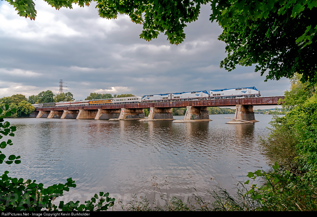 The American Association of Private Rail Car Owners (AAPRCO) special, operating as Amtrak 854, is crossing the Mohawk River at Schenectady, New York, on the approach to the Schenectady station and the beginning of an 8-mile reverse move on Canadian Pacific Railway's Canadian Subdivision.