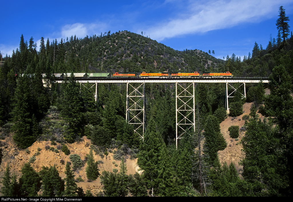 A Burlington Northern Santa Fe freight on the “Inside Gateway” route crosses spectacular Clear Creek Trestle near Keddie, California, on March 13, 2000. Three GE C44-9Ws with a EMD SD40-2 kicker power the train.