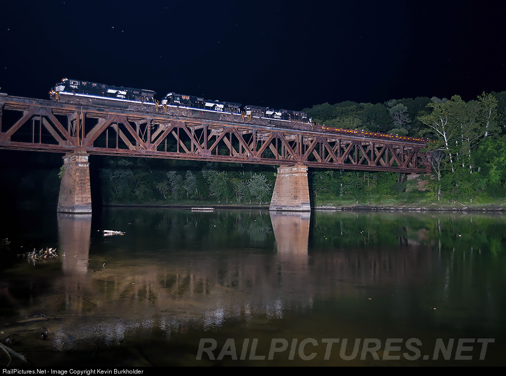 On September 9, 2014, a trio of matched 'horsehead' Norfolk Southern GE locos work across the Connecticut River at East Deerfield, Massachusetts, on NS/PAS train 23K. The consist of NS ES40DC 7693, C40-9 8782, and C40-9W 9915 leads the intermodal train westbound from Ayer, Massachusetts to Chicago-47th Street Yard, IL.