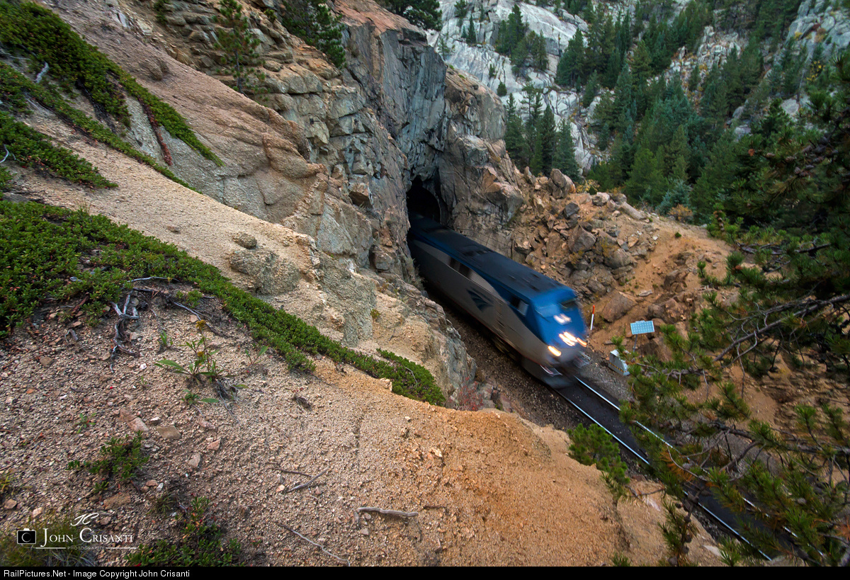 A two hour late Amtrak #6 races out of Tunnel #29 in the tunnel district after meeting a westbound manifest at Pinecliffe.