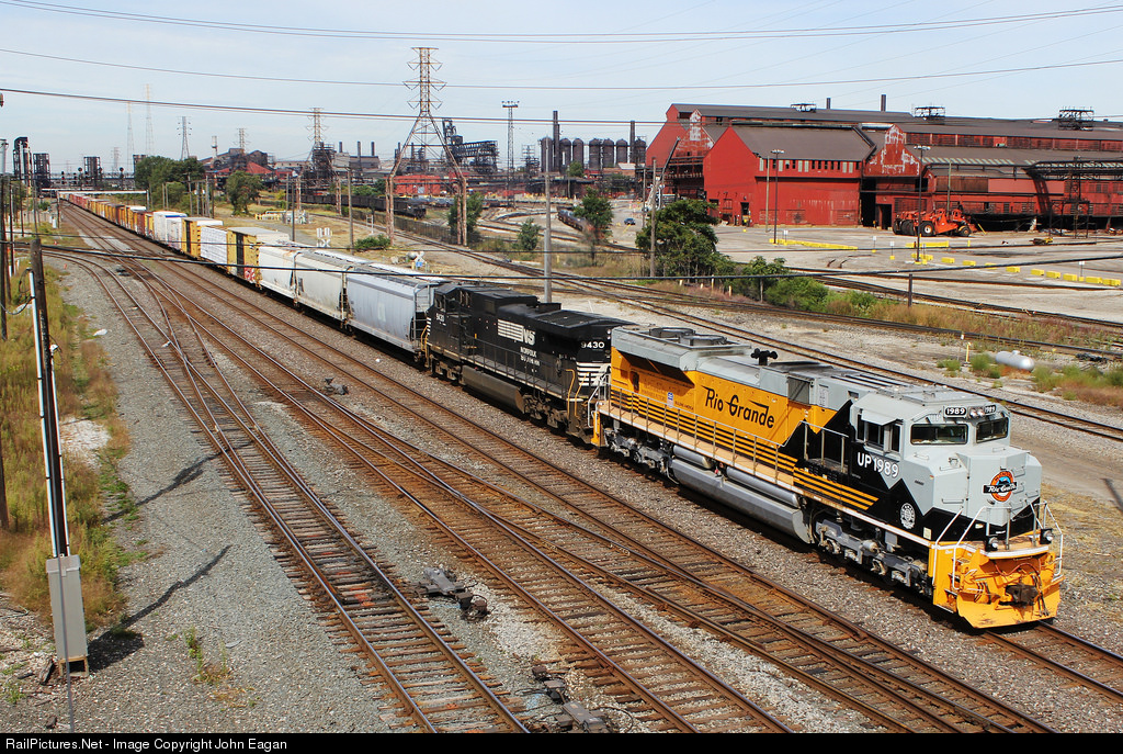 The Union Pacific's Rio Grande unit heads NS train 16E through the decidedly urban landscape of East Chicago, IN on 9/24/2014 at 12:05pm. This train would not get much further, the dispatcher would have him tie down at CP497 and wait for a crew and wheels coming from Elkhart, IN.