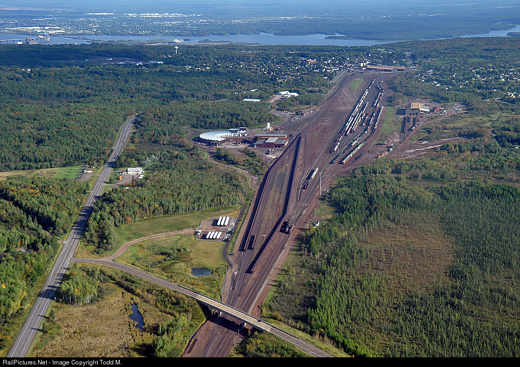 What was once strictly an ore staging yard for the mines of northern Minnesota has now become a freight sorting yard as well as can be seen on the middle right. DMIR 215 prepares to begin it's afternoon switching duties of freight cars towards the north end of the yard. The City of Proctor lies at the top or southern end of the yard. The Richard Bong bridge linking Duluth, MN and Superior Wisconsin is located in the upper left. That's Wisconsin across the St. Louis river. |