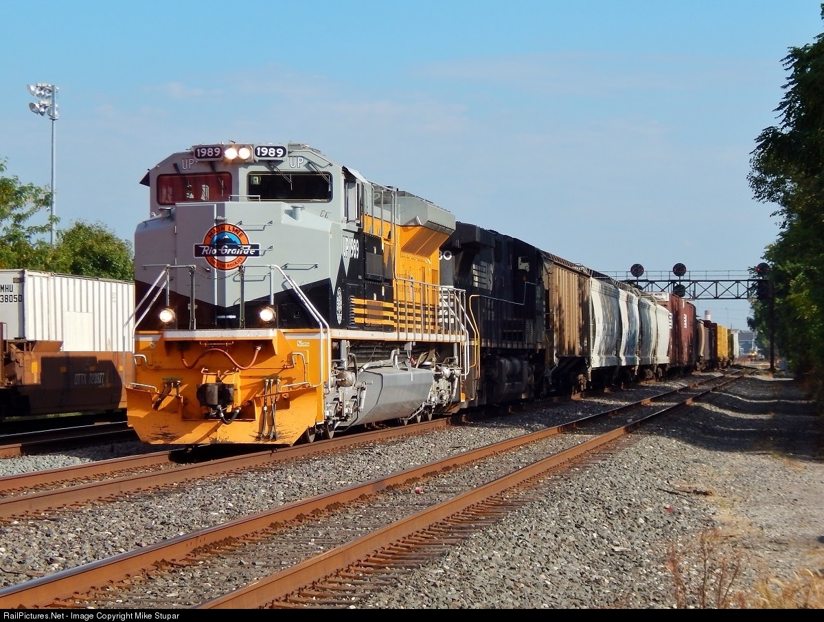 UP 1989, in the Rio Grande Heritage paint scheme, leads NS 33E along Norfolk Southern's Chicago Line and through Hammond, IN.