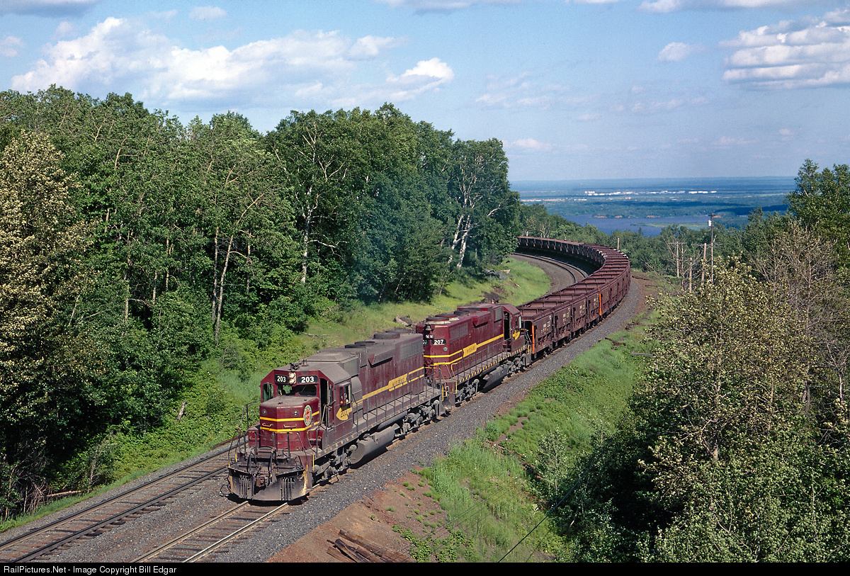 DMIR 203 and 207 round the famous curve near the top of Proctor Hill with a trainload of ore empties returning from the Duluth dock to Proctor Yard for shipment back to the iron range. The St. Louis River and Superior, WI can be viewed in the background.